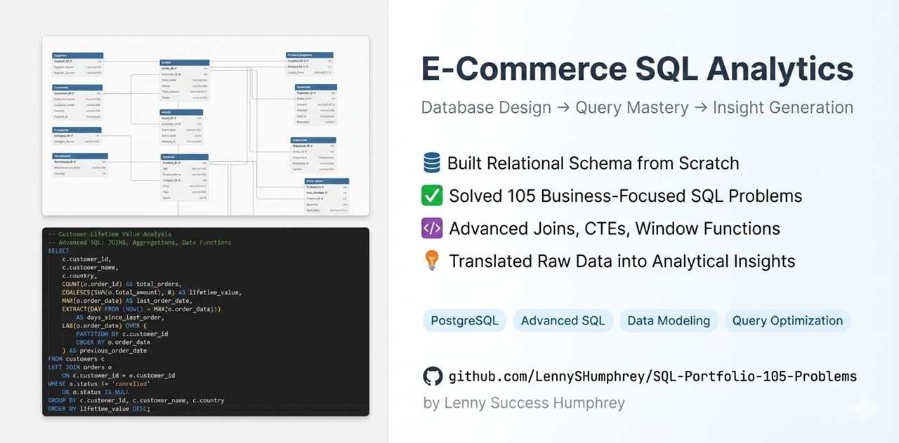A self-built e-commerce analytics project where I designed a relational database and used SQL to answer practical business questions around revenue, customers, and product performance. Built 105 progressively complex queries — from joins to CTEs and window functions — with a focus on transforming raw data into clear, decision-ready insights.